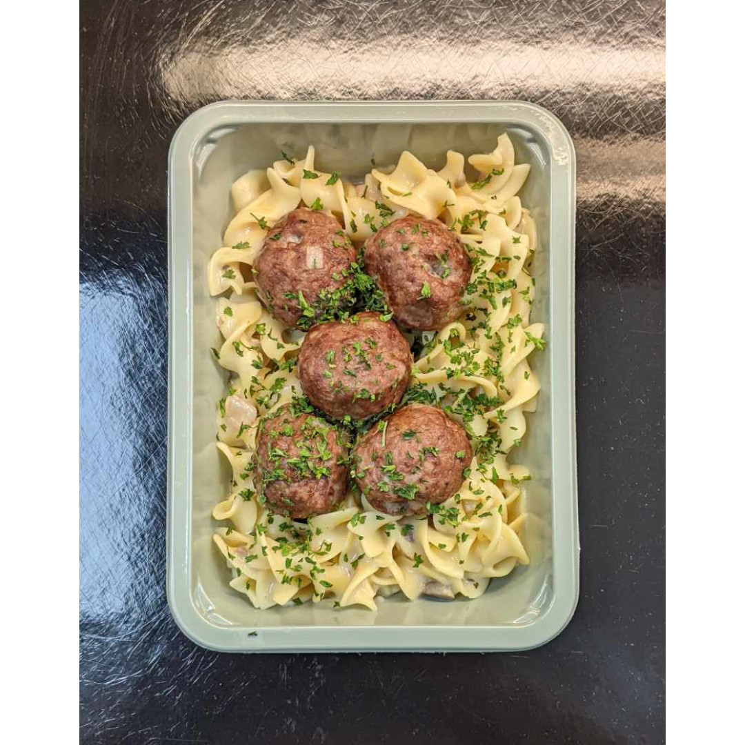 Des boulettes de bœuf tendres, cuites au four, servies avec des nouilles aux œufs et nappées d’une sauce onctueuse à la crème de champignons. Un plat réconfortant, savoureux et complet, prêt en quelques minutes.